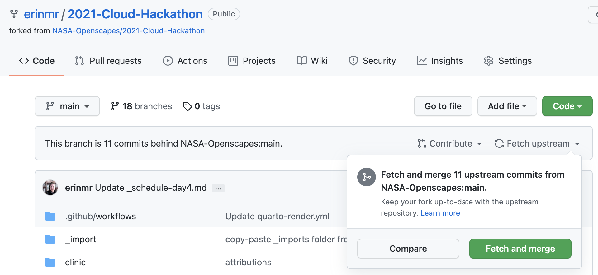 The daily setup has 2 steps: get the latest into your forked copy of the repo, then get the latest of your fork into your JupyterHub.