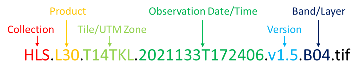 NOTE that HLS data is mapped to the Universal Transverse Mercator (UTM) projection and is tiled using the Sentinel-2 Military Grid Reference System (MGRS) UTM grid. Notice that in the list of links we have multiple tiles, i.e. T14TKL & T13TGF, that intersect with our region of interest. In this case, these two tiles represent neighboring UTM zones. The tiles can be discern from the file name, which is the last element in a link (far right) following the last forward slash (/) - e.g., HLS.L30.T14TKL.2021133T172406.v1.5.B04.tif. The figure below explains where to find the tile/UTM zone from the file name.