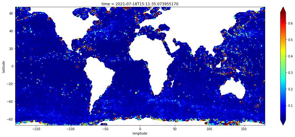 =slice(-67.0, 67.0)).plot(robust=True, cmap="jet", figsize=(18, 7)) stddev.sel(latitude