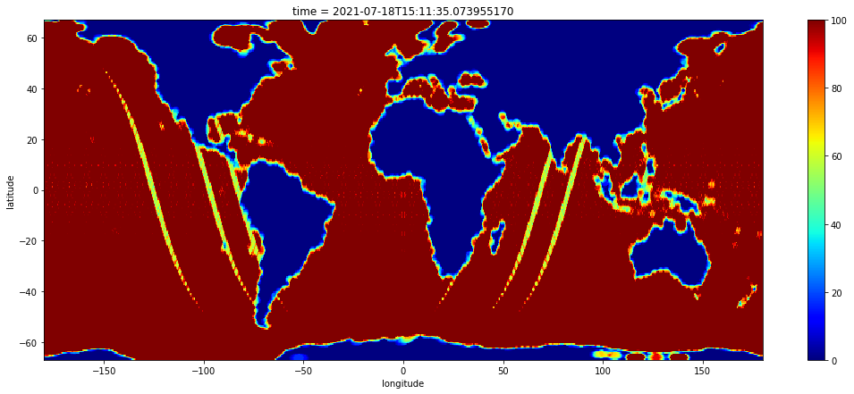 =slice(-67.0, 67.0)).plot(robust=True, cmap="jet", figsize=(18, 7)) counts.sel(latitude