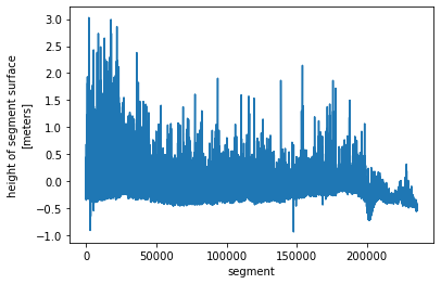 <xarray.Dataset> Dimensions: (segment: 235584) Dimensions without coordinates: segment Data variables: latitude (segment) float64 82.38 82.38 82.38 ... 72.61 72.61 longitude (segment) float64 -55.11 -55.11 ... 145.1 145.1 delta_time (segment) float64 4.642e+07 4.642e+07 ... 4.642e+07 height_segment_height (segment) float32 nan nan nan ... -0.4335 -0.4463 sea_surface_temperature (segment) float32 263.4 263.4 263.4 ... nan nan nan