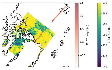 This specific example explores the pairing of the ICESat-2 ATL07 Sea Ice Height data product, currently (as of November 2021) available publicly via direct download at the NSIDC DAAC, along with Sea Surface Temperature (SST) from the GHRSST MODIS L2 dataset (MODIS_A-JPL-L2P-v2019.0) available from PO.DAAC on the Earthdata Cloud.
